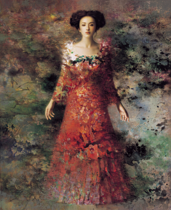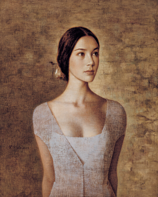 十多年前,一位動人的“少女”突然出現(xiàn)在我們的視線周圍——她雙眸深情而婉約、寧靜而飄逸,她那黑柔的秀發(fā),嬌美的面容,令人倍感賞心悅目。雖輕紗羅縵,卻似乎要比那白紗絲絳還要一塵不染,性感而又不失純真。凝脂且纖細的臂膀環(huán)抱著一只土陶,卻沒有一絲一毫地玷污她干凈到徹底的典雅、高貴,反而是給如此唯美的東方神韻更增添了一份古典意味的穩(wěn)重,一絲追憶歷史的遐想,于是在她身后,是無垠無際的滄海桑田……這幅作品便是廣州美術(shù)學院碩士生導師謝楚余老師的成名之作——《陶》!《陶》一經(jīng)問世,便以一種中西合璧的美打動世人,在海內(nèi)外都引起極大的轟動。