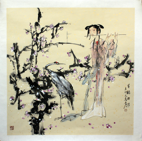 “詩意在言外,畫境在意中”李江用水墨的新描繪著東方女性特有的萬千氣質(zhì),與寫實(shí)人物畫相比更添了幾分遐想和自由的氛圍。在《有鶴相伴》一畫中,同樣是以女性題材來表達(dá)畫面主體的,卻配以仙鶴、梅花為大場景,似是由遠(yuǎn)及近的靜靜觀賞。畫中襯景占據(jù)畫面的三分之二,在紅梅掩映之中一名女子亭亭玉立,輕啟紅唇吹奏一曲天籟之音,翩翩笑意嫣然臉上,身邊仙鶴靜立,似是聆聽女子用笛聲訴說的故事,抑或是為這天籟之音所吸引而停止前行。作品用筆細(xì)膩流暢,色彩搭配絲絲入扣,遙相輝映,將人的內(nèi)心與動物的感知融為一體,更與梅花之景相輔相成。