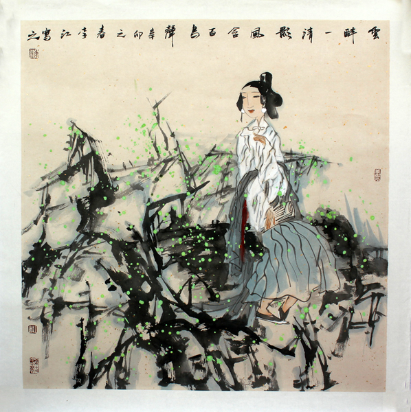 李江的女性人物寫意已有自己的筆墨趣味,她在構(gòu)圖和色彩上的處理雅致、脫俗,大膽地用筆墨勾畫人物的線條并用沒骨的畫法繪制襯景,卻在極大與極小的對比中襯托出“細(xì)”,提煉線條品質(zhì),有意地削弱和淡化線條的勾勒,將人物的形體輪廓巧妙地融入墨色之中,使之隨意的滲化為一種富于形式美感的水墨肌理。在賦色上,她將人物造型的適度夸張與色調(diào)的情感趨向作了相比,吸收唐施釉法。使色彩與墨色自由融合為一種斑駁而自然的彩釉效果,如真如幻的“光影”,從而使畫面顯得古樸雅致耐看,素凈雅致,華而不俗,給人一種輕松寧靜而又不失沉穩(wěn)深厚的視覺感染力。