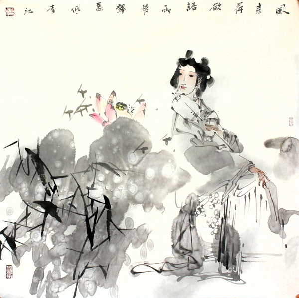 女畫家李江的人物畫以前人外形肖似、傳神為基礎(chǔ),通過對女性形象的刻畫,將中國傳統(tǒng)女性的溫柔美麗,善良淳樸呈現(xiàn)的淋漓盡致。李江的寫意人物畫,在筆墨情趣上有很大的突破,主要特點(diǎn)是細(xì)致的描繪了人物的面部表情及肢體動作,以此來表達(dá)人物內(nèi)心豐富的情感。其次,在李江的畫中女性人物的出場總是有花團(tuán)錦簇的襯托,以花之姿來襯托女性對美好事物的憧憬和向往。從而突出筆墨的趣味,使人物主題在筆墨的色澤中得以充分的展現(xiàn)。