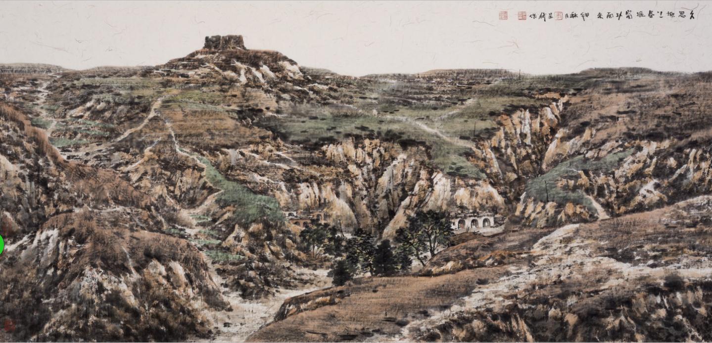 今年秋天,他再次來到黃土高原。這是個(gè)好季節(jié),秋日的陽光依然是暖洋洋的,與冬日的赤裸裸的坦蕩不同,這時(shí)被黃色、紅色、綠色的樹木稼禾裝點(diǎn)著的黃土高原是另一番情景。世世代代人們在這里繁衍生息,在秋日的陽光下,成為可以觀覽,可以品味,可以生發(fā)無數(shù)聯(lián)想的所在,激蕩著作為一個(gè)中國畫家關(guān)于自然、關(guān)于藝術(shù)、關(guān)于社會的想象。