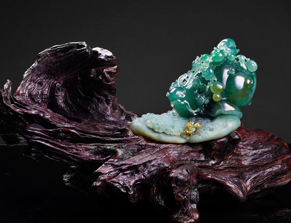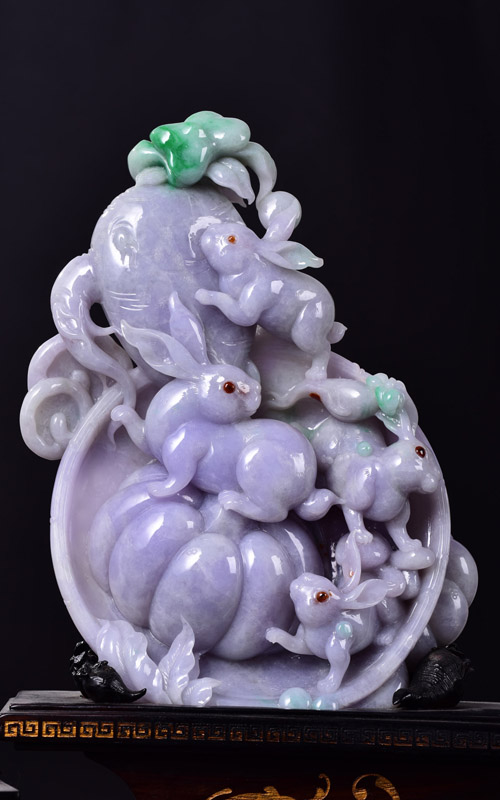 《吐納春秋》: 作品用春帶彩翡翠為原材料,質(zhì)地細(xì)膩,造型生動,難能可貴的是作者把天然紅中帶黑的顏色巧妙地雕刻為十六只玉兔的眼睛,猶如畫龍點睛般生華。每只兔子都動態(tài)各異,活潑可愛,身手敏捷,寓意老少身體健康。所獲獎項:2012年中國玉(石)器百花獎金獎; 2012-2013年度肇慶市工藝美術(shù)精品展獲“工藝美術(shù)精品獎”; 2012年中華玉雕“華表獎”銀獎。
