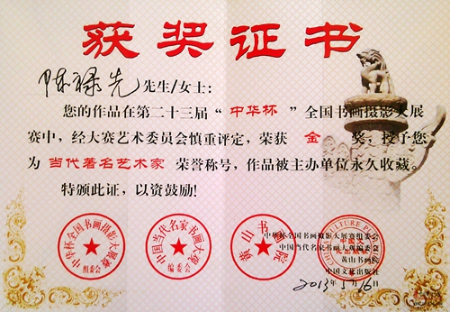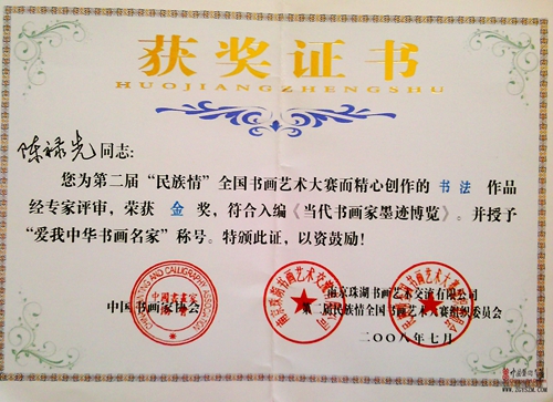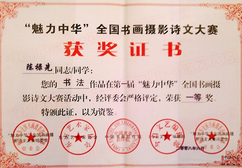 第五屆“盛世中華杯”中國美術(shù)書法大賽金獎;“陽光杯”全國書畫攝影詩文大賽特等獎;2008奧運(yùn)杯暨全國第七屆“廬山杯”書畫大賽銀獎。