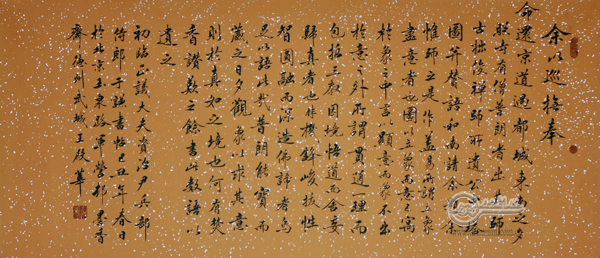 中國(guó)書法藝術(shù)博大精深,源遠(yuǎn)流長(zhǎng),要成就事業(yè),必須苦下功夫。王殿華老師平時(shí)公務(wù)繁忙,但他仍然在工作余暇專心致志讀帖、臨帖、研帖,一遍遍地臨摹王羲之的《蘭亭序》、懷仁的集王《圣教序》,趙孟頫的《壽春堂記》、《膽巴碑》,以及歐陽(yáng)詢、米芾、黃庭堅(jiān)、啟功等古今名家碑帖,爛熟于心,深得要訣。他把握寶貴光陰,研讀了上百余部書法理論專著,吸納古今書法精華,博采眾美。長(zhǎng)期修行,師古不薄今,厚積薄發(fā),其作品結(jié)構(gòu)嚴(yán)謹(jǐn),體態(tài)俊秀,用筆清朗,章法自然,神采飛揚(yáng)而不張揚(yáng),意韻深厚而不苦澀。幾十年間,王殿華老師書內(nèi)書外靜心揣摩,從其它藝術(shù)門類中汲取精神學(xué)養(yǎng)。他創(chuàng)作詩(shī)歌、散文、報(bào)告文學(xué)、小說上百篇,主編《走向世界的中國(guó)工程兵》等幾十部著作。文學(xué)藝術(shù)的修養(yǎng)豐富了他的人生,又夯實(shí)了他書法藝術(shù)的深厚底蘊(yùn);反之,書法藝術(shù)的銳進(jìn),又促進(jìn)了文學(xué)藝術(shù)的深化。