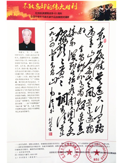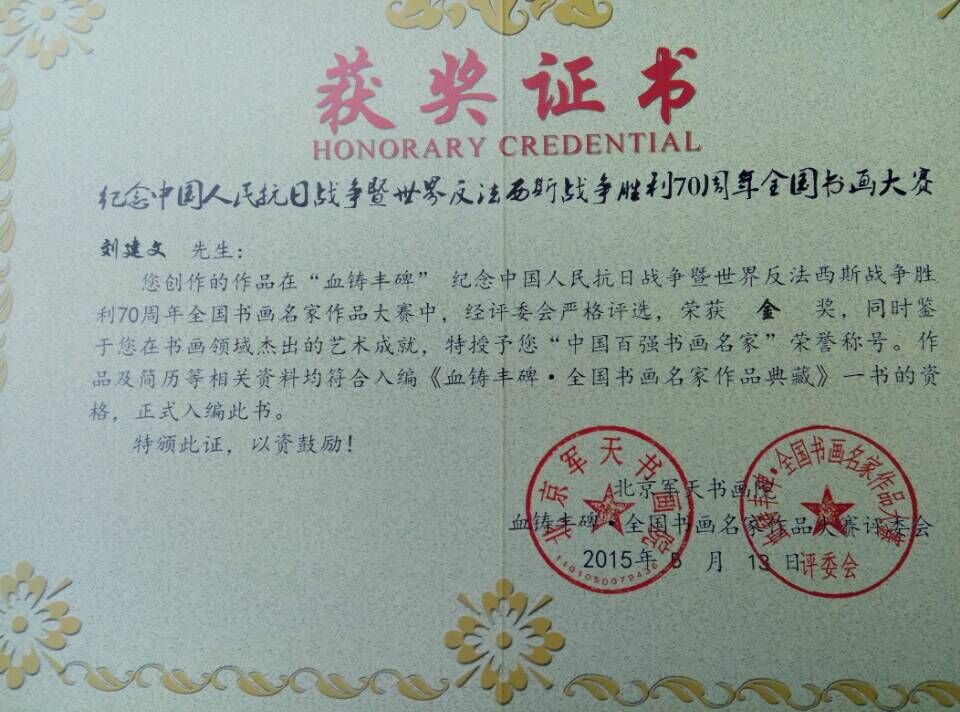 2015年6月,創(chuàng)作的作品在紀(jì)念抗美援朝戰(zhàn)爭(zhēng)65周年全國(guó)中老年書(shū)畫(huà)名家作品大賽中榮獲“金”獎(jiǎng),北京東方蘭亭國(guó)際書(shū)畫(huà)藝術(shù)中心、北京翰墨國(guó)際書(shū)畫(huà)藝術(shù)交流中心、中華大唐書(shū)畫(huà)藝術(shù)學(xué)會(huì)(香港)、不能忘卻的偉大勝利. 全國(guó)中老年書(shū)畫(huà)名家作品大賽評(píng)委會(huì)特授予“中華愛(ài)國(guó)功勛藝術(shù)名家”榮譽(yù)稱(chēng)號(hào),作品入編《不能忘卻的偉大勝利. 全國(guó)中老年書(shū)畫(huà)名家作品選集》一書(shū)出版發(fā)行。