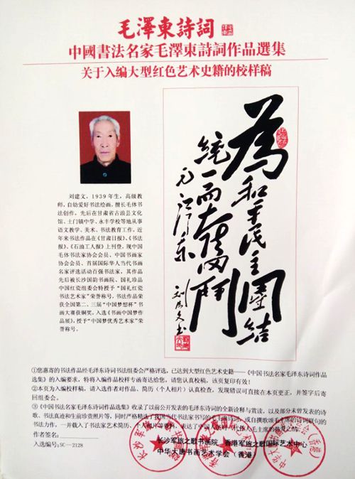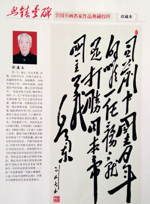 劉建文,現(xiàn)為中國(guó)毛體書(shū)法家協(xié)會(huì)會(huì)員,中國(guó)書(shū)畫(huà)家協(xié)會(huì)會(huì)員,中國(guó)當(dāng)代書(shū)畫(huà)名家協(xié)會(huì)會(huì)員。字,慈心.江山多嬌,甘肅古浪縣永豐堡村人。自幼愛(ài)好書(shū)法繪畫(huà),擅長(zhǎng)毛體書(shū)法創(chuàng)作,一直追求偉人風(fēng)范、緬懷偉人情懷,六、七十年代在古浪縣專(zhuān)業(yè)從事繪畫(huà)“忠”字臺(tái)大型毛澤東肖像、墻體字畫(huà)、電影院幻燈片繪制、戲臺(tái)場(chǎng)景布置、毛體書(shū)法臨摹、臨帖和創(chuàng)作等工作,且在當(dāng)?shù)睾椭苓叺貐^(qū)頻繁進(jìn)行素描畫(huà)像、美術(shù)油畫(huà)、樓閣牌匾創(chuàng)作、書(shū)法交流等工作,頗受全國(guó)各地書(shū)墨愛(ài)好者的好評(píng),求“字”拜墨者絡(luò)繹不接,參賽獲獎(jiǎng)作品或書(shū)法珍品被愛(ài)好者收藏。