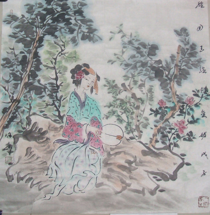 在徐康的畫作中,能讀到詩詞,能讀到散文和小品,能在賞畫時品味到詩詞、散文、戲曲等中國文化的傳統(tǒng)之美,更能品味人生、賞讀歷史,會感受到他的仕女畫深深扎根于民族藝術(shù)的土壤,攫取民族文化的精華。感受到徐康在對人物形象的選取中,十分注重歷史的文化性、人物的代表性和突出的個性,在他的畫作中,女詩人是其繪畫創(chuàng)作的一條文化生命線,這也是徐康先生心靈深處的文化價值的依歸。在他的作品中,詩畫相通,詩人與畫家能超越時空進(jìn)行心靈的對話。在他的筆下,許多作品大都選材于李清照、朱淑真、謝道韞等歷史女名家的詩詞之意。“小院閑窗春色深”、“云中誰寄錦書來”、“風(fēng)柔日薄春猶早”、“幾點(diǎn)催花雨”、“小紅紙唱我吹簫”、“應(yīng)是綠肥紅瘦”等畫作的題款,大都取之宋詞唐詩,特別是女詞人的詩意,其畫中自然以這些女性的形象,傳達(dá)了一種文化品格和精神旨向。那人物的情感和謝道韞身后的古松,朱淑貞背后的皓月,李清照身旁的芭蕉、黃花,都在“寄情于物”、“物我兩化”的意境中,凸顯出了人物的思緒和情感,也使我們看到了畫家對主體人物命運(yùn)的把脈。在那輕靈松動的線條中,在那清新婉約的倩影中,在那意韻優(yōu)美的詩詞題款中,既領(lǐng)略到了詩畫一體的中國傳統(tǒng)文化之美,也看到了畫家的那濃厚的文化和藝術(shù)修養(yǎng)。