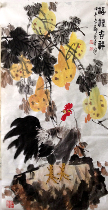 在現(xiàn)實中生活中,石榴是季節(jié)性的,過了成熟的季節(jié),再吃到鮮美可口的石榴就不那么容易了;而先生這幅《福壽吉祥》上的石榴,始終保持的成熟的狀態(tài),你那兩個裂開口的石榴,一定是里面石榴子太多,太肥了,才把十分堅固的石榴皮撐開,石榴子裸露在外面,石榴樹下這兩只雞在想,既然石榴象征著多子多福,我們吃了豈不是也能多下蛋,孵出更多的小雞兒,給主人帶來更多的吉祥,所以它們視乎正在一起商量著,如何啄下那些已經(jīng)成熟而且裂開口的石榴呢!其實,筆者看著這一個個汁多果肥的石榴,也已經(jīng)垂涎欲滴了。真想伸出手來摘下幾個,哪怕是裂開口的那個也行,若再不摘,恐怕就被這兩只雞啄下了。