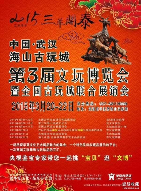壹號(hào)收藏網(wǎng)訊 2015年3月20日——2015年3月31日,中國(guó)•武漢第三屆文玩博覽會(huì)暨全國(guó)古玩城聯(lián)合展銷(xiāo)會(huì)將在武漢海山古玩城隆重舉行。本次活動(dòng)包含全國(guó)各地民間特色收藏品展示、高端古玩珍寶交易及藝術(shù)品交流、鑒寶、拍賣(mài)等內(nèi)容。屆時(shí),民間專(zhuān)業(yè)收藏家及來(lái)自全國(guó)各地的業(yè)內(nèi)500多家高端文玩參展商將到會(huì)交流交易,展現(xiàn)華夏文化藝術(shù)品魅力。