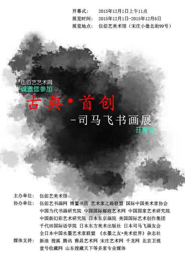 展訊:由伍佰藝美術(shù)館主辦的“古典·首創(chuàng)—司馬飛書畫展”將于2015年12月1日上午11點在北京市通州區(qū)宋莊伍佰藝美術(shù)館開幕。據(jù)悉,伍佰藝藝術(shù)網(wǎng)、博鰲書院、藝術(shù)家之路聯(lián)盟、國際中國美術(shù)家協(xié)會、中國當(dāng)代書畫研究院、中國國際郵政藝術(shù)網(wǎng)、中國國家藝術(shù)研究院、中國新幻彩藝術(shù)研究院、《水墨之友·美術(shù)世界》雜志社、日本東京畫院、美國國際藝術(shù)創(chuàng)作集團(tuán)、日本東方美術(shù)出版社、千代田國際語學(xué)院、全日本中國水墨藝術(shù)家聯(lián)盟、日本司馬飛畫友會、, 山東大學(xué)金諦國際交流中心、鄭州大學(xué)中國畫研究院等機(jī)構(gòu)對此次展覽給予了大力的支持。