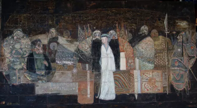 關(guān)聯(lián)西方技法,孫路在東方精神的表達(dá)上進(jìn)行新的探索。以多年的西方見聞和生活經(jīng)驗(yàn)作為支持,她以坦培拉畫法描繪中國(guó)傳統(tǒng)的仕女、京劇形象和具有中國(guó)特征的風(fēng)景,在圖式和肌理之間,創(chuàng)造有機(jī)的關(guān)聯(lián)。中國(guó)傳統(tǒng)戲曲文化營(yíng)造強(qiáng)烈的東方情境,戲曲人物的臉譜、衣飾作為載體傳達(dá)著濃郁的東方氣質(zhì)。在作品《鐘馗嫁妹》中,巨大的尺幅的畫面中形式感極強(qiáng)的戲曲人物以強(qiáng)烈對(duì)比的黑白關(guān)系呈現(xiàn)出一種當(dāng)代繪畫的活力!缎℃(zhèn)往事》則以江南水鄉(xiāng)的樣式呈現(xiàn)一種帶有東方情趣的民間生活。以水道貫穿的小鎮(zhèn)生活返璞歸真,以坦培拉描繪的民間生活別有一種風(fēng)味。同時(shí)《九九重陽》、《荷》等作品以花卉靜物為主題,呈現(xiàn)了一種靜謐安詳?shù)那榫常c凝結(jié)著時(shí)間和真誠的坦培拉材料形成有機(jī)的互文。展覽同時(shí)還展出孫路上世紀(jì)90年代于法國(guó)的創(chuàng)作,作品中明顯的裝飾風(fēng)格和現(xiàn)代主義傾向回應(yīng)了那一段異域經(jīng)歷,同時(shí)畫面中極具東方特色的配色和細(xì)節(jié)的處理成為旅居藝術(shù)家尋找身份心路歷程的記錄。